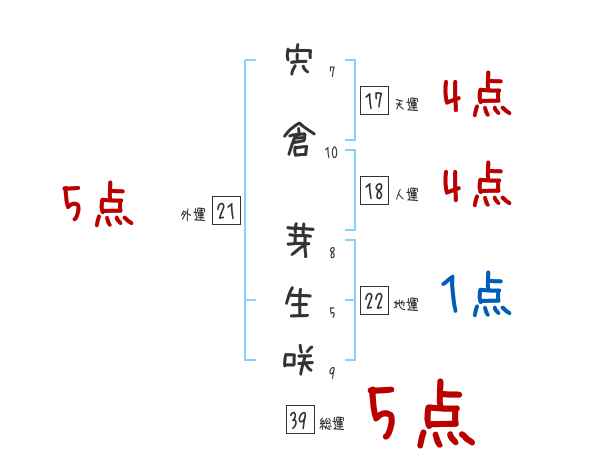 総運![]() | 宍倉芽生咲さんの総運は39画の5つ星!社交性に優れ人望が厚い。人の上に立ち成功する。 あなたの人生を表す1番重要な運勢です。生涯を通じて影響する総合運となり、主に50歳以降の晩年期に影響を及ぼします。 |
