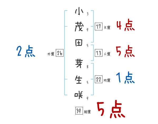 外運![]() | 小茂田芽生咲さんの外運は26画の2つ星!波瀾万丈かも。信頼できる人を大事にしましょう。 生活面を象徴する運勢です。外部から受ける影響力を表し、結婚運、家庭運や職場、環境への順応性を表します。 |