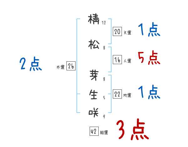 外運![]() | 棈松芽生咲さんの外運は26画の2つ星!波瀾万丈かも。信頼できる人を大事にしましょう。 生活面を象徴する運勢です。外部から受ける影響力を表し、結婚運、家庭運や職場、環境への順応性を表します。 |