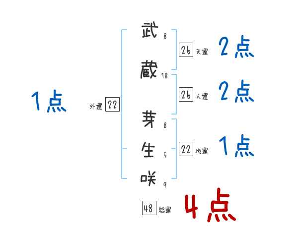 天運![]() | 武蔵芽生咲さんの天運は26画の2つ星!波瀾万丈かも。信頼できる人を大事にしましょう。 家系が持つ宿命的な運勢を表します。祖先から受け継いだ苗字ですので自分の力が及びません。家柄を象徴します。 |