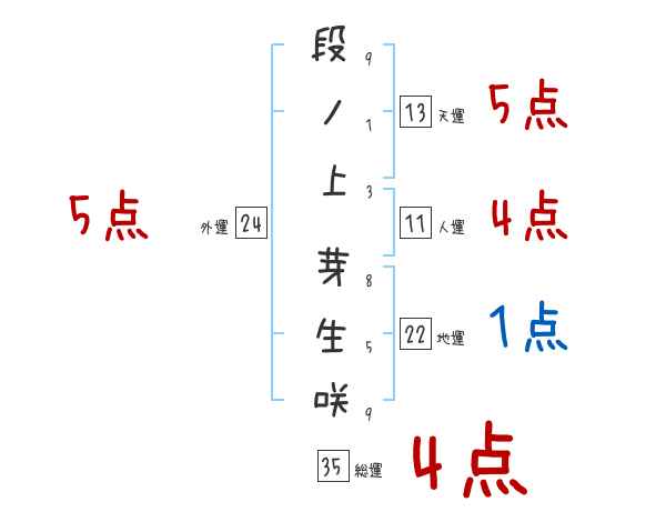 総運![]() | 段ノ上芽生咲さんの総運は35画の4つ星!温厚な性格で感受性が高い。穏和な性格で人望が厚い。 あなたの人生を表す1番重要な運勢です。生涯を通じて影響する総合運となり、主に50歳以降の晩年期に影響を及ぼします。 |