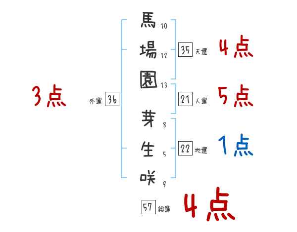 外運![]() | 馬場園芽生咲さんの外運は36画の3つ星!先見性が豊かです。多少神経質で苦労することも。 生活面を象徴する運勢です。外部から受ける影響力を表し、結婚運、家庭運や職場、環境への順応性を表します。 |