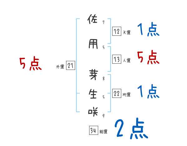 外運![]() | 佐用芽生咲さんの外運は21画の5つ星!統率力がある。独立し成功する。名誉を手に入れる。 生活面を象徴する運勢です。外部から受ける影響力を表し、結婚運、家庭運や職場、環境への順応性を表します。 |