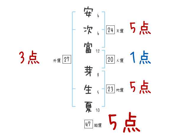 天運![]() | 安次富芽生夏さんの天運は24画の5つ星!家庭運が良く順調な人生。金運にも恵まれる。 家系が持つ宿命的な運勢を表します。祖先から受け継いだ苗字ですので自分の力が及びません。家柄を象徴します。 |