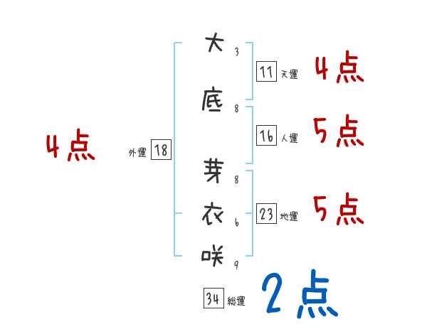 天運![]() | 大底芽衣咲さんの天運は11画の4つ星!着実に富や地位を得る幸運な人生。 家系が持つ宿命的な運勢を表します。祖先から受け継いだ苗字ですので自分の力が及びません。家柄を象徴します。 |