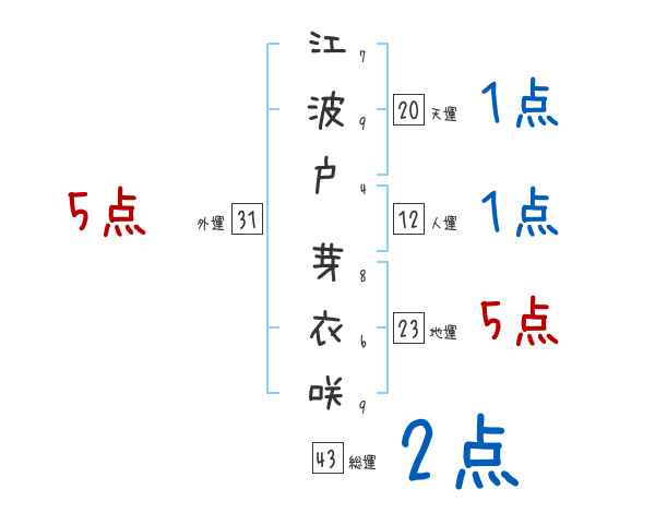 外運![]() | 江波戸芽衣咲さんの外運は31画の5つ星!社交性があり判断力に優れる。順風満帆な人生で円満な生活。 生活面を象徴する運勢です。外部から受ける影響力を表し、結婚運、家庭運や職場、環境への順応性を表します。 |