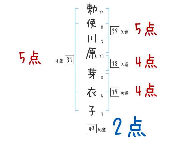 天運![]() | 勅使川原芽衣子さんの天運は32画の5つ星!柔軟性があり成功する。チャンスが多く金運が良い。 家系が持つ宿命的な運勢を表します。祖先から受け継いだ苗字ですので自分の力が及びません。家柄を象徴します。 |