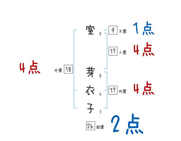 天運![]() | 室芽衣子さんの天運は9画の1つ星!消極的で才能を発揮することが苦手なことも。周りの意見に耳を傾けましょう。 家系が持つ宿命的な運勢を表します。祖先から受け継いだ苗字ですので自分の力が及びません。家柄を象徴します。 |