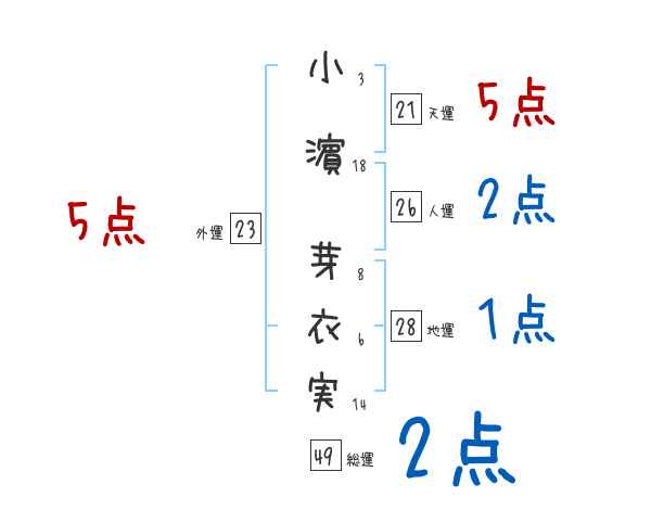 外運![]() | 小濵芽衣実さんの外運は23画の5つ星!想像力に優れ活力がある。一代で成功し名誉を手に入れる。 生活面を象徴する運勢です。外部から受ける影響力を表し、結婚運、家庭運や職場、環境への順応性を表します。 |