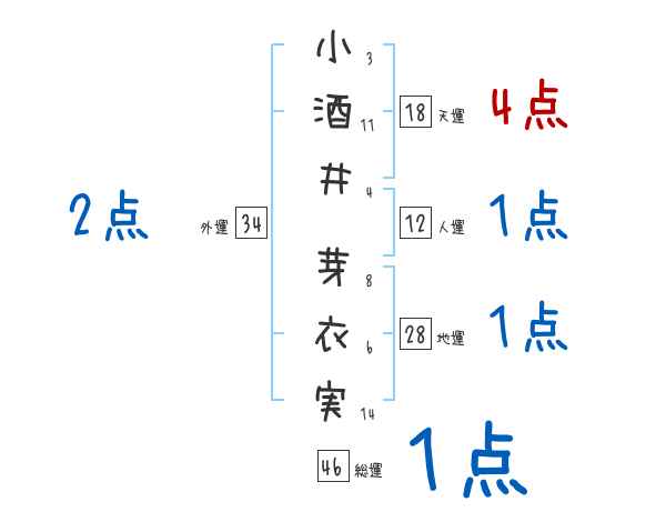 天運![]() | 小酒井芽衣実さんの天運は18画の4つ星!情熱的で剛気。忍耐力があり信頼される。 家系が持つ宿命的な運勢を表します。祖先から受け継いだ苗字ですので自分の力が及びません。家柄を象徴します。 |