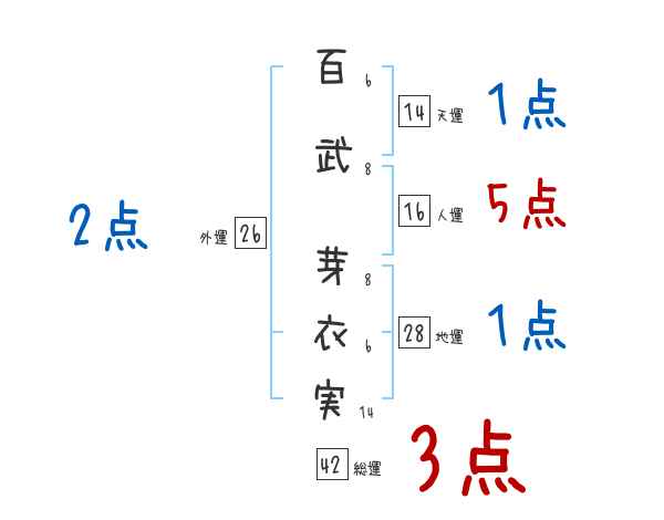 外運![]() | 百武芽衣実さんの外運は26画の2つ星!波瀾万丈かも。信頼できる人を大事にしましょう。 生活面を象徴する運勢です。外部から受ける影響力を表し、結婚運、家庭運や職場、環境への順応性を表します。 |