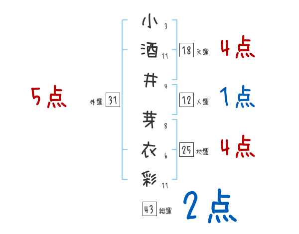 天運![]() | 小酒井芽衣彩さんの天運は18画の4つ星!情熱的で剛気。忍耐力があり信頼される。 家系が持つ宿命的な運勢を表します。祖先から受け継いだ苗字ですので自分の力が及びません。家柄を象徴します。 |