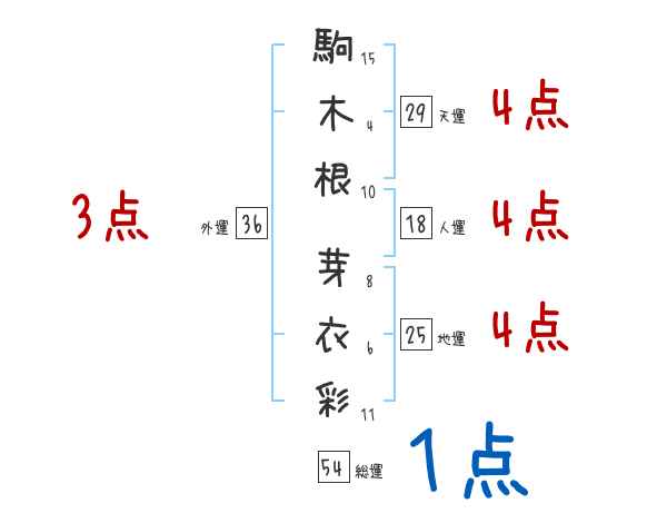 外運![]() | 駒木根芽衣彩さんの外運は36画の3つ星!先見性が豊かです。多少神経質で苦労することも。 生活面を象徴する運勢です。外部から受ける影響力を表し、結婚運、家庭運や職場、環境への順応性を表します。 |