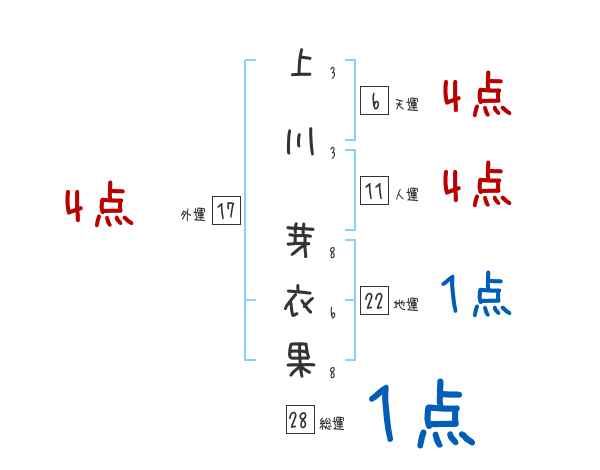 外運![]() | 上川芽衣果さんの外運は17画の4つ星!積極的な行動力。地位を気づき財産を手に入れる。純粋な心と直感力。 生活面を象徴する運勢です。外部から受ける影響力を表し、結婚運、家庭運や職場、環境への順応性を表します。 |