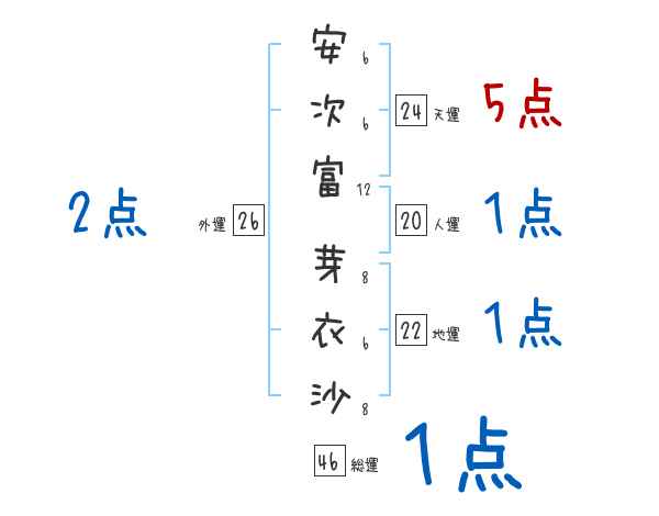 外運![]() | 安次富芽衣沙さんの外運は26画の2つ星!波瀾万丈かも。信頼できる人を大事にしましょう。 生活面を象徴する運勢です。外部から受ける影響力を表し、結婚運、家庭運や職場、環境への順応性を表します。 |
