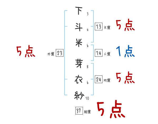 天運![]() | 下斗米芽衣紗さんの天運は13画の5つ星!才能に恵まれ人気がある。名声を手に入れる。円満な人生。 家系が持つ宿命的な運勢を表します。祖先から受け継いだ苗字ですので自分の力が及びません。家柄を象徴します。 |