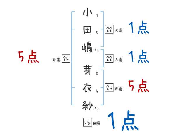 外運![]() | 小田嶋芽衣紗さんの外運は24画の5つ星!家庭運が良く順調な人生。金運にも恵まれる。 生活面を象徴する運勢です。外部から受ける影響力を表し、結婚運、家庭運や職場、環境への順応性を表します。 |