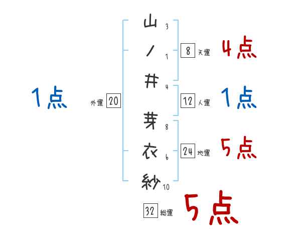 総運![]() | 山ノ井芽衣紗さんの総運は32画の5つ星!柔軟性があり成功する。チャンスが多く金運が良い。 あなたの人生を表す1番重要な運勢です。生涯を通じて影響する総合運となり、主に50歳以降の晩年期に影響を及ぼします。 |