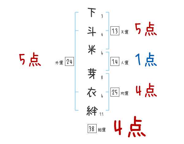 天運![]() | 下斗米芽衣絆さんの天運は13画の5つ星!才能に恵まれ人気がある。名声を手に入れる。円満な人生。 家系が持つ宿命的な運勢を表します。祖先から受け継いだ苗字ですので自分の力が及びません。家柄を象徴します。 |