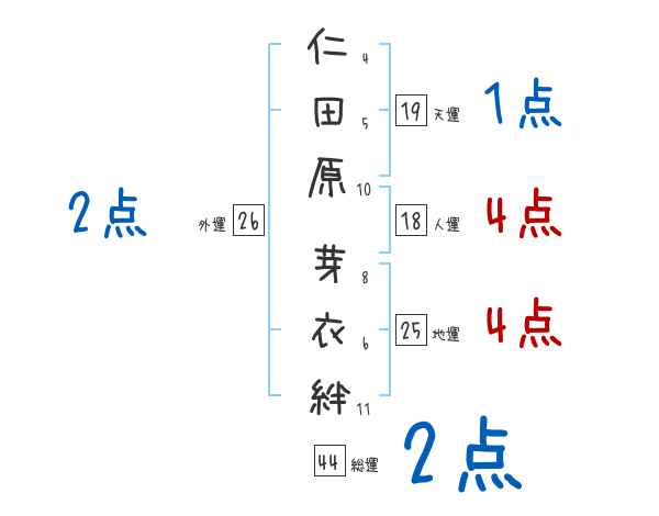 総運![]() | 仁田原芽衣絆さんの総運は44画の2つ星!誠実で慎重な性格。物事を考えすぎないように注意しましょう。 あなたの人生を表す1番重要な運勢です。生涯を通じて影響する総合運となり、主に50歳以降の晩年期に影響を及ぼします。 |