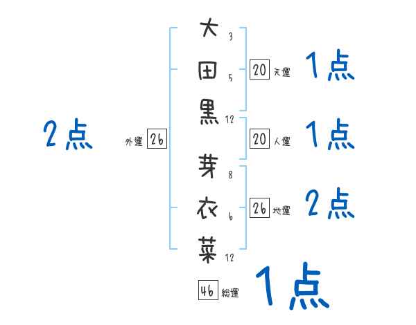 外運![]() | 大田黒芽衣菜さんの外運は26画の2つ星!波瀾万丈かも。信頼できる人を大事にしましょう。 生活面を象徴する運勢です。外部から受ける影響力を表し、結婚運、家庭運や職場、環境への順応性を表します。 |