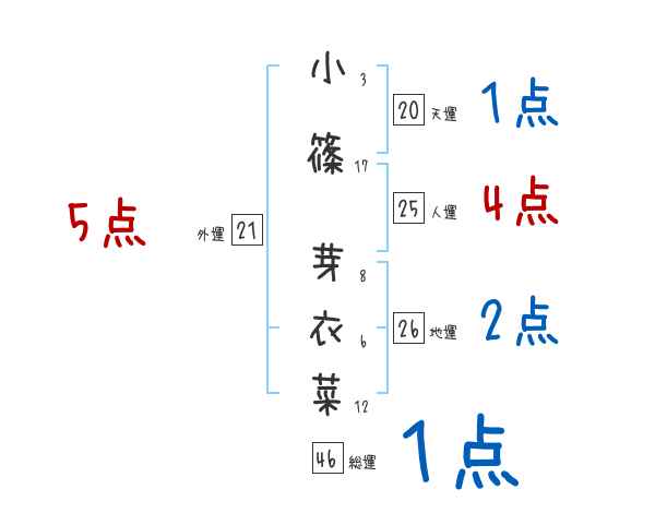 外運![]() | 小篠芽衣菜さんの外運は21画の5つ星!統率力がある。独立し成功する。名誉を手に入れる。 生活面を象徴する運勢です。外部から受ける影響力を表し、結婚運、家庭運や職場、環境への順応性を表します。 |