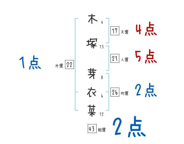 外運![]() | 木塚芽衣菜さんの外運は22画の1つ星!努力することが苦手ないっぽう手先が器用。芸術性にも優れる。 生活面を象徴する運勢です。外部から受ける影響力を表し、結婚運、家庭運や職場、環境への順応性を表します。 |
