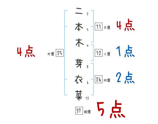 天運![]() | 二本木芽衣菜さんの天運は11画の4つ星!着実に富や地位を得る幸運な人生。 家系が持つ宿命的な運勢を表します。祖先から受け継いだ苗字ですので自分の力が及びません。家柄を象徴します。 |