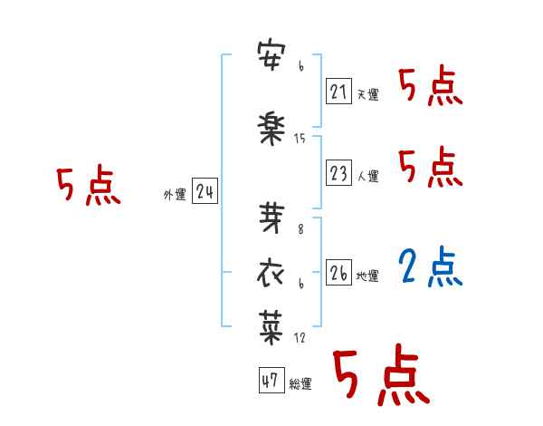 外運![]() | 安楽芽衣菜さんの外運は24画の5つ星!家庭運が良く順調な人生。金運にも恵まれる。 生活面を象徴する運勢です。外部から受ける影響力を表し、結婚運、家庭運や職場、環境への順応性を表します。 |