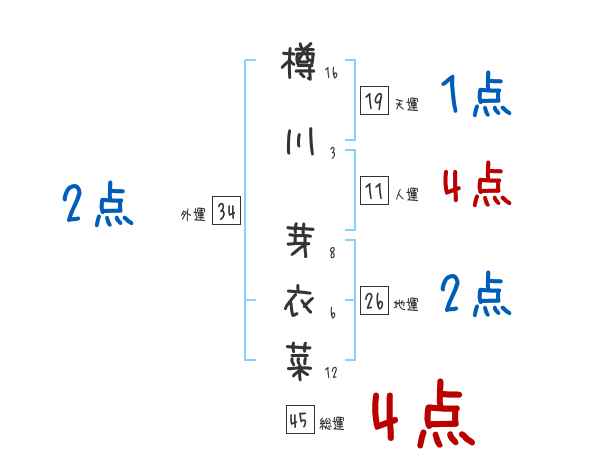 総運![]() | 樽川芽衣菜さんの総運は45画の4つ星!もくもくと物事を進め達成する。地味な努力家。 あなたの人生を表す1番重要な運勢です。生涯を通じて影響する総合運となり、主に50歳以降の晩年期に影響を及ぼします。 |