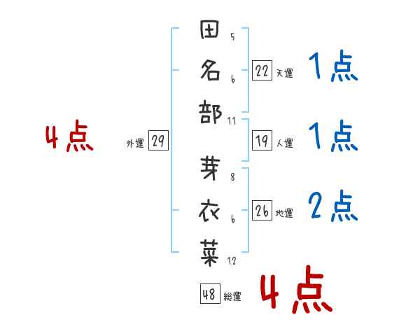 天運![]() | 田名部芽衣菜さんの天運は22画の1つ星!努力することが苦手ないっぽう手先が器用。芸術性にも優れる。 家系が持つ宿命的な運勢を表します。祖先から受け継いだ苗字ですので自分の力が及びません。家柄を象徴します。 |