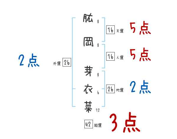 外運![]() | 肱岡芽衣菜さんの外運は26画の2つ星!波瀾万丈かも。信頼できる人を大事にしましょう。 生活面を象徴する運勢です。外部から受ける影響力を表し、結婚運、家庭運や職場、環境への順応性を表します。 |