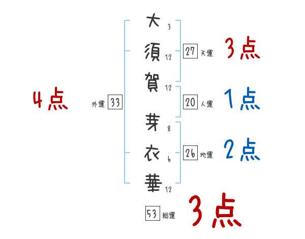 外運![]() | 大須賀芽衣華さんの外運は33画の4つ星!権力志向でプライドが高い。勇気があり運を切り開き成功する。 生活面を象徴する運勢です。外部から受ける影響力を表し、結婚運、家庭運や職場、環境への順応性を表します。 |