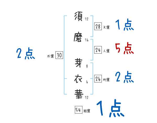 地運![]() | 須磨芽衣華さんの地運は26画の2つ星!波瀾万丈かも。信頼できる人を大事にしましょう。 個性を表す基礎的な運勢です。性格形成や対人関係、行動力など家庭環境に影響されます。主に誕生してから20歳くらいまでの若年期の運勢を表します。 |