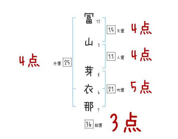 天運![]() | 冨山芽衣那さんの天運は15画の4つ星!人徳があり出世する。順調に物事を進め円満な人生。 家系が持つ宿命的な運勢を表します。祖先から受け継いだ苗字ですので自分の力が及びません。家柄を象徴します。 |