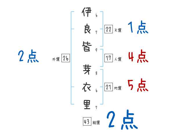 総運![]() | 伊良皆芽衣里さんの総運は43画の2つ星!頑固な性格で独立心が強いかも。やや非現実的で浪費に注意しましょう。 あなたの人生を表す1番重要な運勢です。生涯を通じて影響する総合運となり、主に50歳以降の晩年期に影響を及ぼします。 |