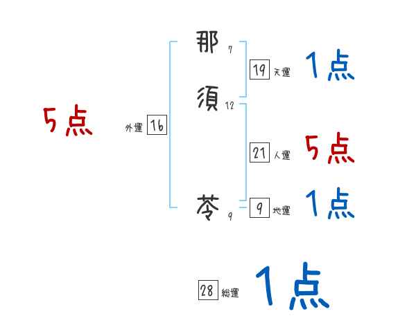 総運![]() | 那須苓さんの総運は28画の1つ星!家庭環境に注意。スポーツで活躍できる能力があるかも。 あなたの人生を表す1番重要な運勢です。生涯を通じて影響する総合運となり、主に50歳以降の晩年期に影響を及ぼします。 |