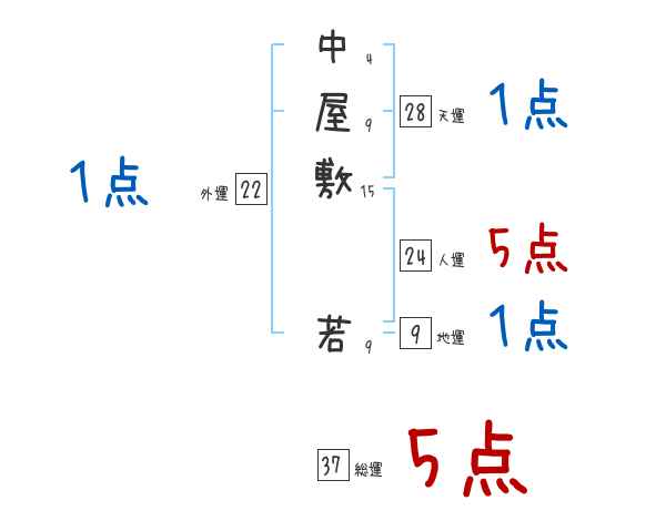 人運![]() | 中屋敷若さんの人運は24画の5つ星!家庭運が良く順調な人生。金運にも恵まれる。 性格や才能などを表す2番目に重要な運勢です。人間関係や協調性、社会的な成功に影響します。主に20歳から50歳ぐらいまでの中年期の運勢を表します。 |