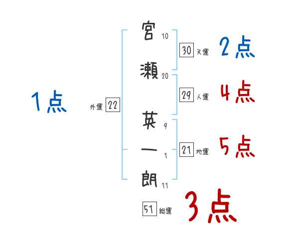 外運![]() | 宮瀬英一朗さんの外運は22画の1つ星!努力することが苦手ないっぽう手先が器用。芸術性にも優れる。 生活面を象徴する運勢です。外部から受ける影響力を表し、結婚運、家庭運や職場、環境への順応性を表します。 |