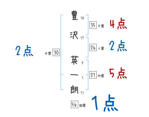 天運![]() | 豊沢英一朗さんの天運は35画の4つ星!温厚な性格で感受性が高い。穏和な性格で人望が厚い。 家系が持つ宿命的な運勢を表します。祖先から受け継いだ苗字ですので自分の力が及びません。家柄を象徴します。 |