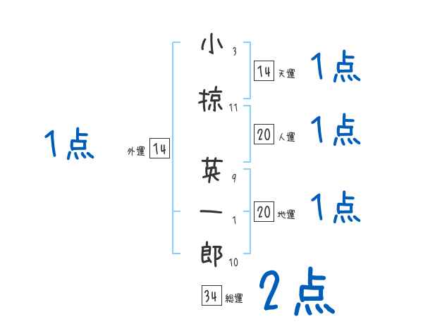 総運![]() | 小掠英一郎さんの総運は34画の2つ星!独創性に優れるが、自尊心が強く災難に注意しましょう。 あなたの人生を表す1番重要な運勢です。生涯を通じて影響する総合運となり、主に50歳以降の晩年期に影響を及ぼします。 |