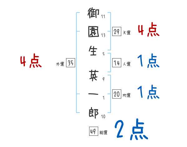 外運![]() | 御園生英一郎さんの外運は35画の4つ星!温厚な性格で感受性が高い。穏和な性格で人望が厚い。 生活面を象徴する運勢です。外部から受ける影響力を表し、結婚運、家庭運や職場、環境への順応性を表します。 |