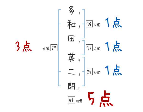 外運![]() | 多和田英二朗さんの外運は27画の3つ星!頭脳明晰だが強情で摩擦が多い傾向。孤立に注意。 生活面を象徴する運勢です。外部から受ける影響力を表し、結婚運、家庭運や職場、環境への順応性を表します。 |