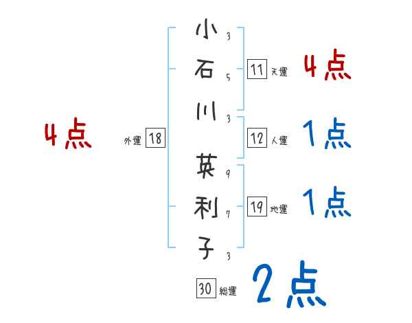 外運![]() | 小石川英利子さんの外運は18画の4つ星!情熱的で剛気。忍耐力があり信頼される。 生活面を象徴する運勢です。外部から受ける影響力を表し、結婚運、家庭運や職場、環境への順応性を表します。 |