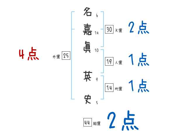 天運![]() | 名嘉眞英史さんの天運は30画の2つ星!浮き沈みの激しさに注意しましょう。 家系が持つ宿命的な運勢を表します。祖先から受け継いだ苗字ですので自分の力が及びません。家柄を象徴します。 |