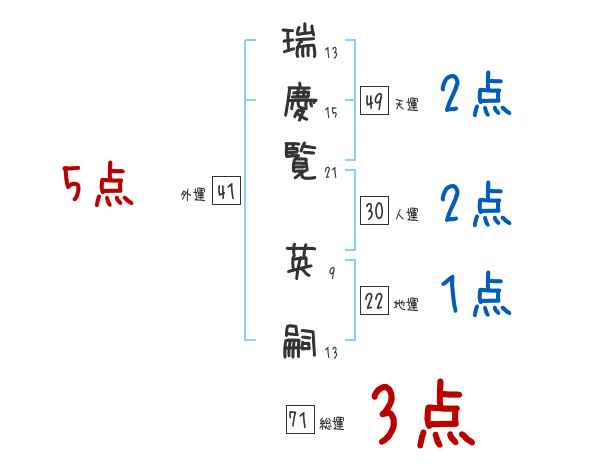 天運![]() | 瑞慶覧英嗣さんの天運は49画の2つ星!不安定な性格で明暗がある人生。周りの人には支援されやすい。 家系が持つ宿命的な運勢を表します。祖先から受け継いだ苗字ですので自分の力が及びません。家柄を象徴します。 |