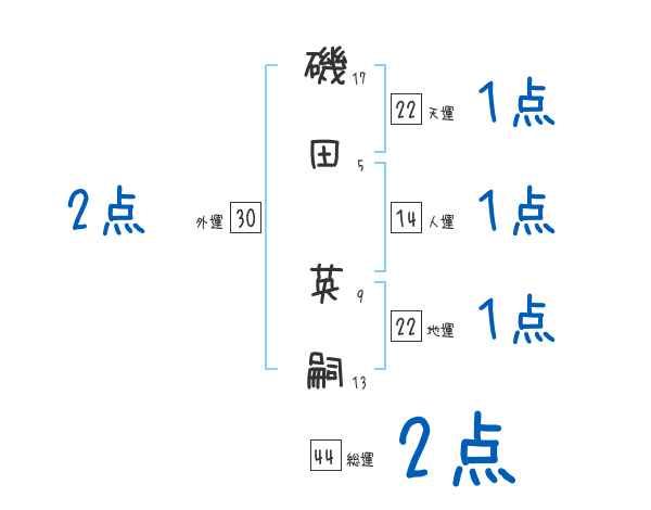外運![]() | 磯田英嗣さんの外運は30画の2つ星!浮き沈みの激しさに注意しましょう。 生活面を象徴する運勢です。外部から受ける影響力を表し、結婚運、家庭運や職場、環境への順応性を表します。 |