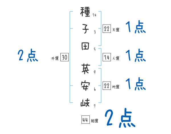 総運![]() | 種子田英安岐さんの総運は44画の2つ星!誠実で慎重な性格。物事を考えすぎないように注意しましょう。 あなたの人生を表す1番重要な運勢です。生涯を通じて影響する総合運となり、主に50歳以降の晩年期に影響を及ぼします。 |