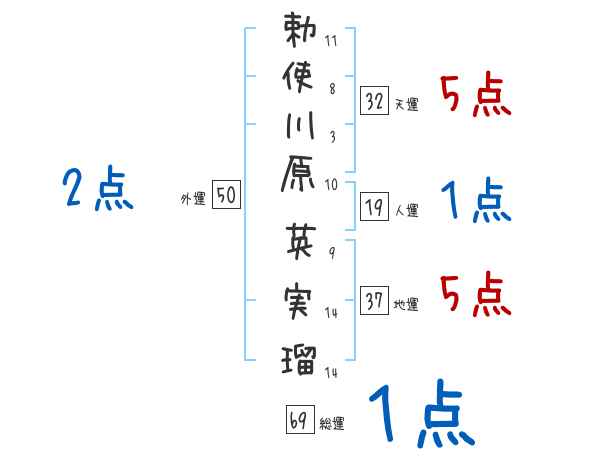 天運![]() | 勅使川原英実瑠さんの天運は32画の5つ星!柔軟性があり成功する。チャンスが多く金運が良い。 家系が持つ宿命的な運勢を表します。祖先から受け継いだ苗字ですので自分の力が及びません。家柄を象徴します。 |