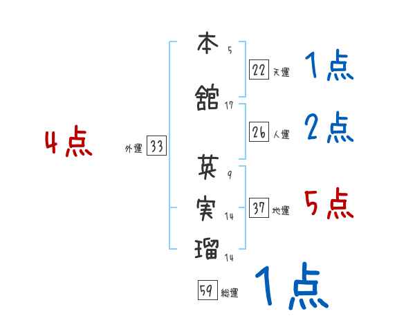 外運![]() | 本舘英実瑠さんの外運は33画の4つ星!権力志向でプライドが高い。勇気があり運を切り開き成功する。 生活面を象徴する運勢です。外部から受ける影響力を表し、結婚運、家庭運や職場、環境への順応性を表します。 |